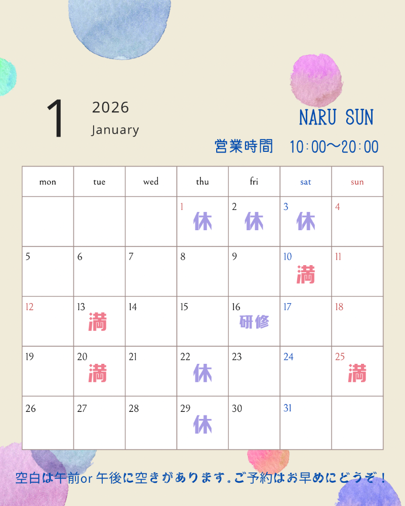 | ◾️60分/¥5,500(初回のみ¥6,000) ◾️90分/¥7,500 ◾️120分/¥10,000 ◾️150分/¥12,500 もみほぐし・足ツボ・ヘッド・ハンド お腹セラピーなどのメニューも組み合わせや 変更も出来ます 西洋医学の解剖学「アナトミーライン」と 東洋医学の気の流れ「経絡」 ナルサンでは、この2つの知見を統合し 筋膜と経絡、両方のラインに働きかける 独自の施術を行っています。 またクラニオセイクラル(頭蓋仙骨療法)を 取り入れ、頭蓋から身体の歪みを調整。 ゆっくりとしたリズムでの施術で 自律神経が整い自然治癒力を高めます。 霊気による“エネルギーの調律”も取り入れています。 お時間のない方・初めての方は60分コース。 定期的なメンテナンスでは90分~120分がおススメ! ➖・こんな方へオススメ・➖ 🔹運動をする習慣がない 🔹肩や首のコリ、背中や腰のハリが気になる 🔹体が硬いと感じる 🔹デスクワークや立ち仕事などで同じ姿勢でいる時間が長い 🔹疲れやストレスがたまっている 🔹自律神経が気になる方 🔹免疫力を上げたい方 🔹呼吸を安定させたい 🔹慢性的な疲れ 🔹緊張が抜けない 🔹心身のリズムが乱れている 🔹自分の軸がブレているような感覚… 🔹なんとなく不調が続く 🔹眠りが浅い・常に緊張している 🔹慢性的な疲労を感じている |